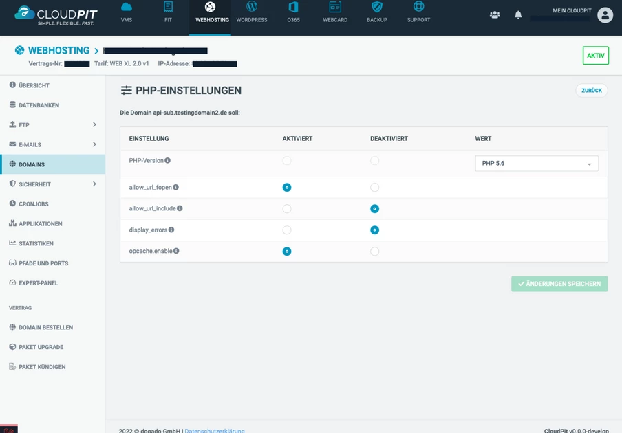 Ausgehend von dieser Gesamtliste kannst du dann in die jeweilige Aktion springen und beispielweise die PHP-Einstellungen ändern oder deine Subdomain bearbeiten.