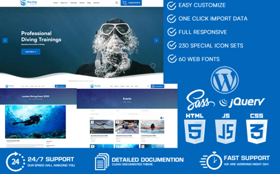Dieses minimalistisch aussehende Theme in blauen und weißen Farben gibt dir die Freiheit, deine Website nach deinen Wünschen zu organisieren. Das Paket enthält alle notwendigen Optionen, um bei deinen potenziellen Kunden einen bleibenden Eindruck zu hinterlassen. Es gibt einen Vollbild-Slider und Spezialeffekte, die über deine Dienste und deren Vorteile informieren. Darüber hinaus erhalten die Benutzer einen erweiterten Suchfilter basierend auf Schlüsselwörtern, Daten, Uhrzeiten, Ereignistypen und Kategorien. Ein Karussell zeigt Kommentare, Teammitglieder, einen Blog und Schulungen.