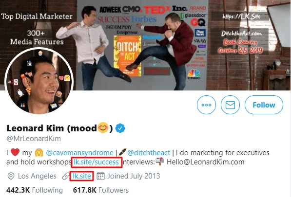 Im Gegensatz zu einem generischen Shortlink ist ein markenbezogener Link dein eigener Link. Es entsteht kein Zweifel daran, wer die Inhalte teilt, und die Nutzer neigen dazu, eine positive Affinität zur Marke und den geteilten Inhalten zu entwickeln. Leonard Kim, einer der führenden Marketingexperten und Mitautor des Buches Ditch The Act nutzt die Domain lk.site für den Aufbau seiner persönlichen Marke.