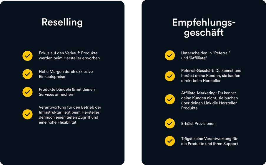 Reselling beschreibt den Wiederverkauf von Produkten des Herstellers durch den Partner, zum Beispiel ein Systemhaus oder eine Digitalagentur, an seine Endkunden, während das Empfehlungsgeschäft den Kauf zwischen Hersteller und Endkunden, beraten durch den Partner, beschreibt. Doch wie genau läuft dieses ab und welches ist die bessere Methode für dein Unternehmen?