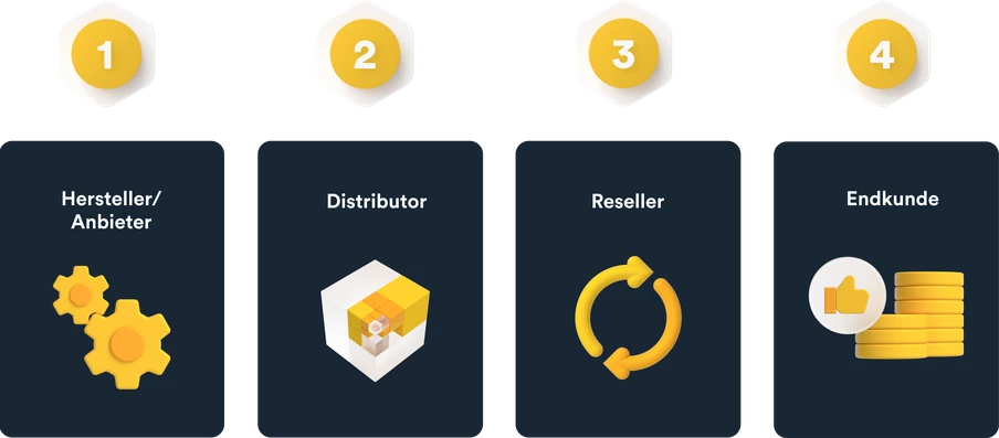 Das einstufige Modell ist der traditionelle Weg, bei dem ein Reseller Produkte oder Dienstleistungen direkt von einem Hersteller oder Anbieter erwirbt und diese dann an seine Kunden vermarktet.