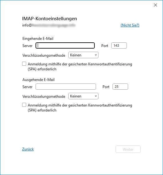 - Gib nun die Daten deines E-Mail-Providers ein. Diese findest du normalerweise in deinem Kundenkonto deines E-Mail-Provider. Du benötigst den Eingangsserver, Ausgangsserver mit den dazu gehörigen Ports.