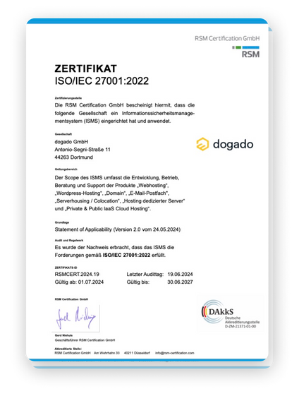 Du vertraust uns deine Daten an. Diesem Vertrauen wollen wir gerecht werden. Um diesem gerecht zu werden haben wir verschiedene Maßnahmen bei dogado umgesetzt, sowohl technischer als auch organisatorischer Natur. u.A.:
