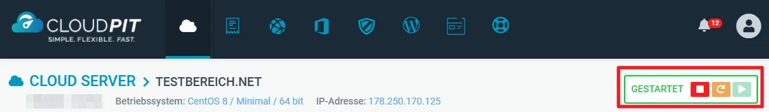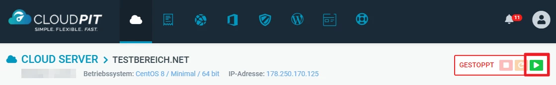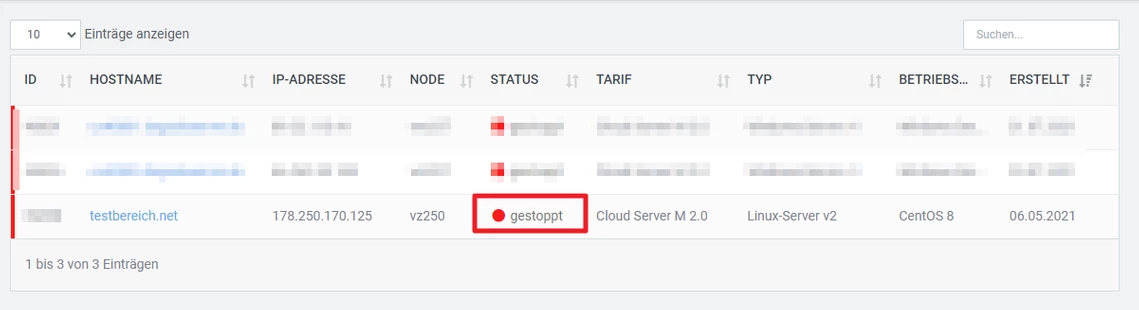 Nach der Installation ist euer vServer noch gestoppt. Um ihr zu starten, klickt ihr auf euren Server und anschließend auf den „grünen Pfeil“.