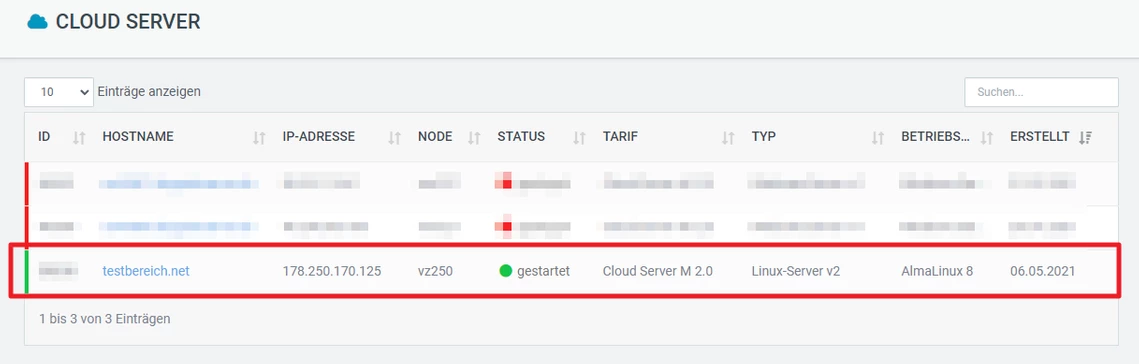 Nun seht ihr alle eure vServer. Hier wählt ihr nun den vServer aus, auf dem ihr CentOS 8 installieren möchtet.
