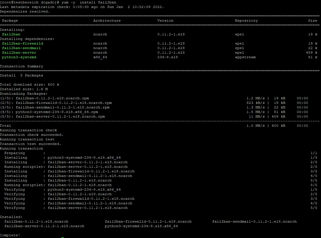 Anschließend könnt ihr mit „STRG+O“ die Datei speichern und mit „STRG+X“ das Programm beenden. Nun müssen wir „fail2ban“ noch neu starten, damit die Änderungen übernommen werden. Gebt dazu folgendes ein: