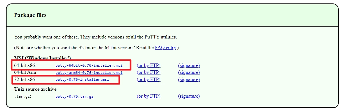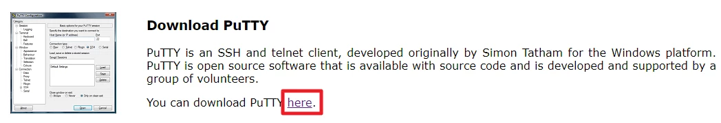 Nachdem ihr euren Server installiert und gestartet habt, wollen wir uns das erste Mal damit verbinden. Dazu benötigt ihr einen SSH Client. Ein kostenloser, beliebter SSH Client ist PuTTy. Klickt auf „here“.