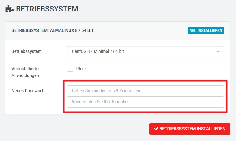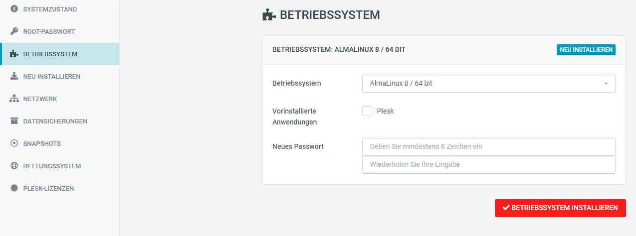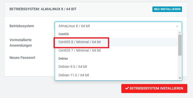 Klickt anschließend auf das aktuelle Betriebssystem eures Servers. Bei mir ist dies in dem Fall „AlmaLinux 8 / 64 bit“.