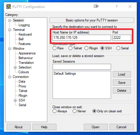 Startet nun Putty und gebt bei „Host Name“ die IP an, welche euch Cloudpit anzeigt. Der Port ist hier 22.