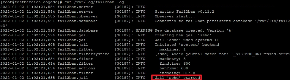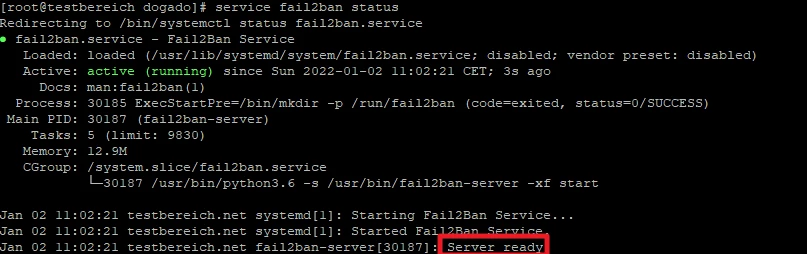 Hier sehen wir nun, dass fail2ban korrekt läuft.