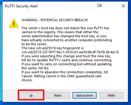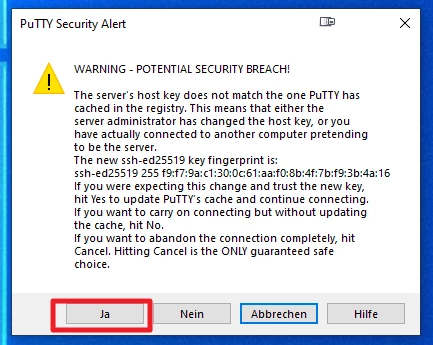 Wichtig ist, dass ihr hier euren „neuen SSH Port“ angebt. Bei mir erscheint nun wieder eine Meldung, dass sich der Server verändert hat. Dies bestätige ich mit „Ja“.