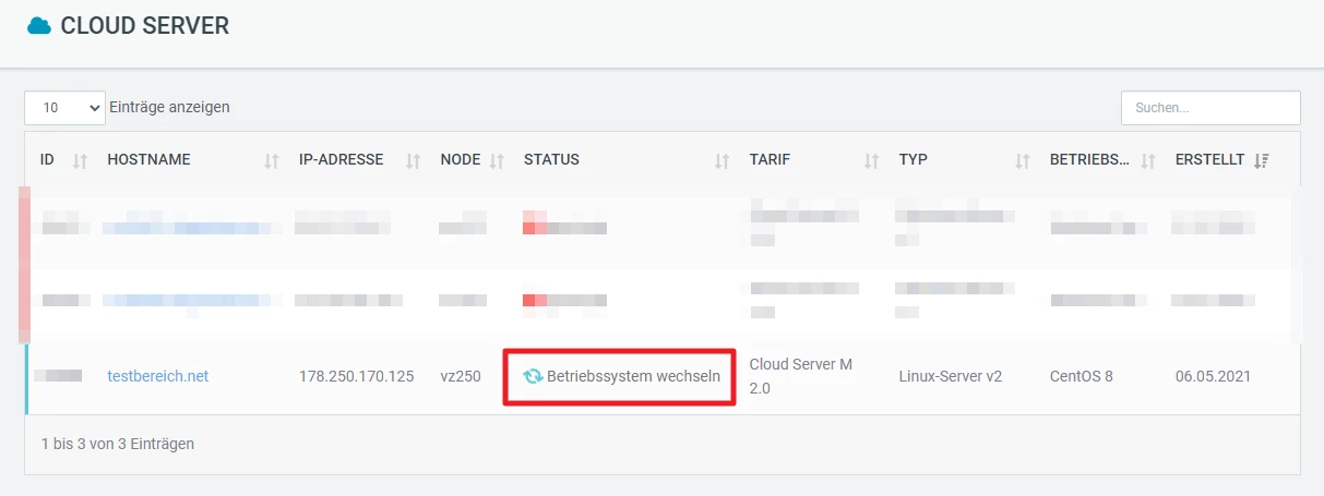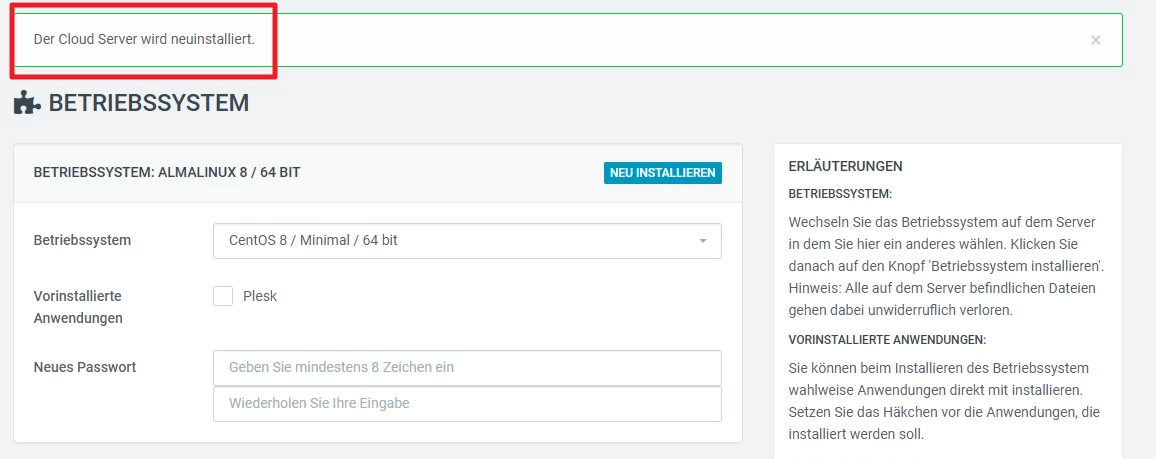 Ihr könnt wieder oben auf die „Wolke“ klicken. Hier sieht ihr die Übersicht eurer Server. In dieser Übersicht sollte dann stehen „Betriebssystem wechseln“. Ihr müsst die Seite öfter dann mit „F5“ aktualisieren.