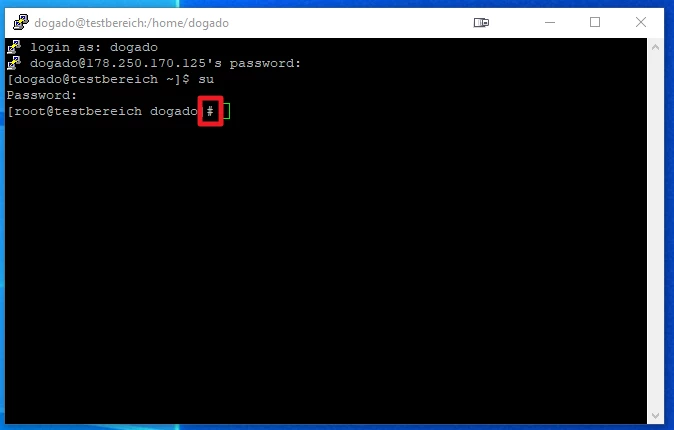 Anhand der „#“ seht ihr, dass ihr nun „root“ seid.