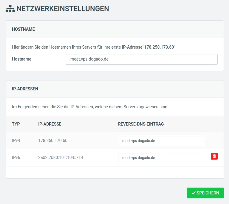 Außerdem wird sichergestellt, dass neben der IPv4- auch eine IPv6-Adresse erstellt und zugeordnet ist, und bei beiden Adressen der Reverse-DNS-Eintrag passend gesetzt ist. Die dazugehörigen Einstellungen finden sich im Cloudpit unter "Cloud Server" > [Server wählen] > "Netzwerk".