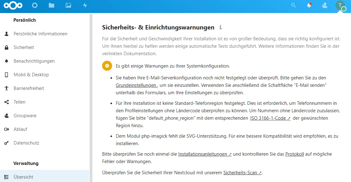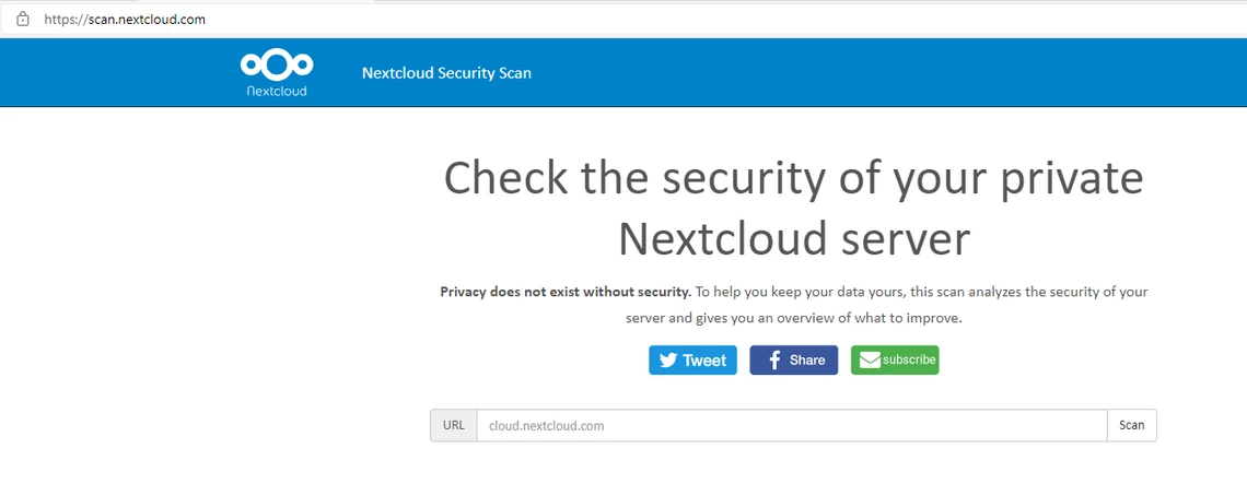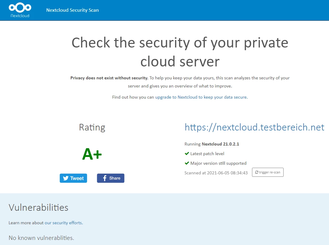 Wir können nun noch überprüfen, ob unsere Nextcloud Installation „sicher“ ist. Dazu geht ihr auf folgende Webseite: https://scan.nextcloud.com