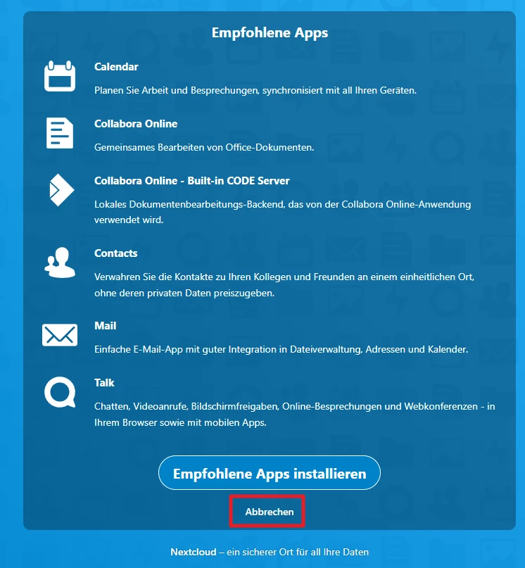 Nun könnt ihr noch wählen, ob die „empfohlenen Apps“ installiert werden sollen. Ich klicke hier auf „Abbrechen“. Die Apps kann man alle später selbst noch installieren.
