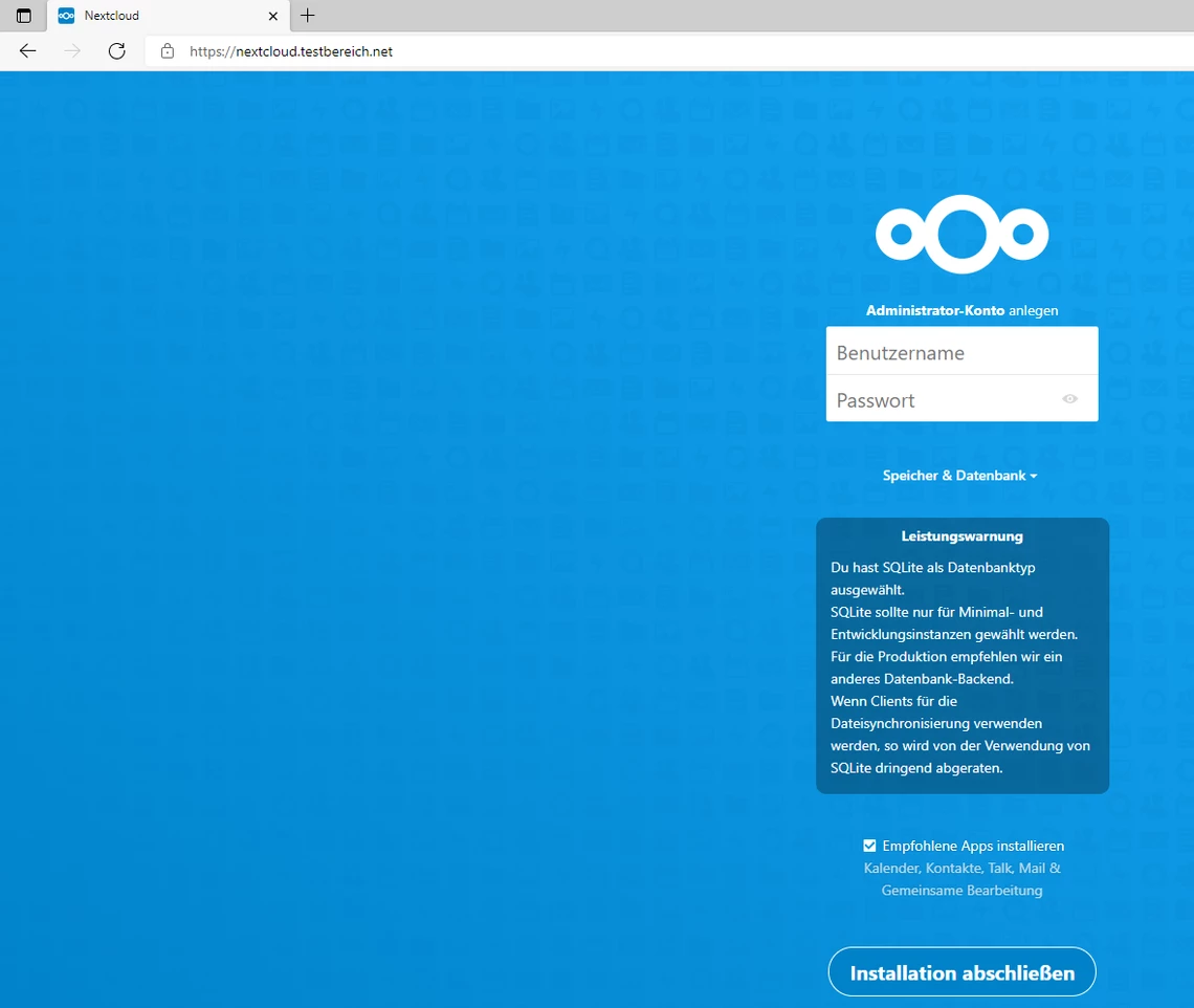 Geht nun mit eurem Webbrowser auf eure Webseite (z.B. nextcloud.euredomain.de). Dort sollte nach einigen Sekunden folgendes zu sehen sein: