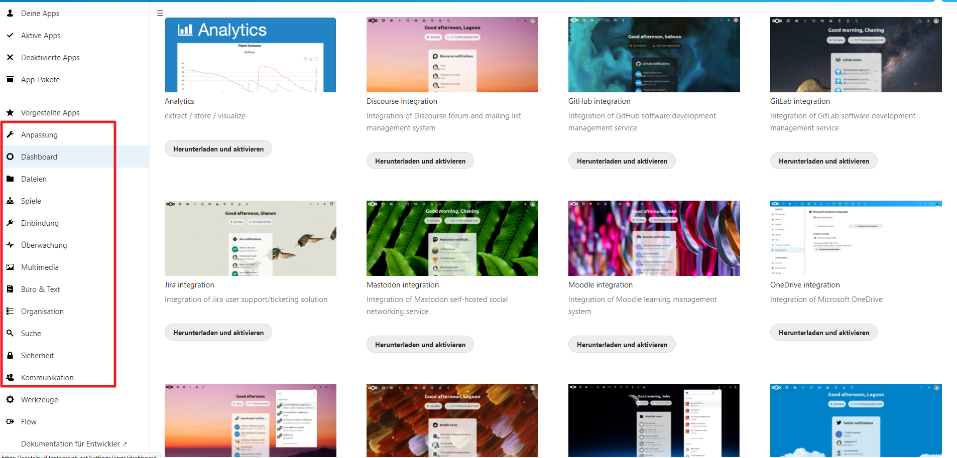 Nun könnt ihr euch aber auch verschiedene Bereiche auswählen. Hier seht ihr dann immer ein Bild und einen kurzen Text zu der Erweiterung. Die Installation gelinkt mit einem Klick auf „Herunterladen und aktivieren“.