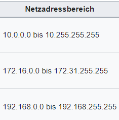 Hier seht ihr die privaten IP-Adressen (Quelle: https://de.wikipedia.org/wiki/Private_IP-Adresse)