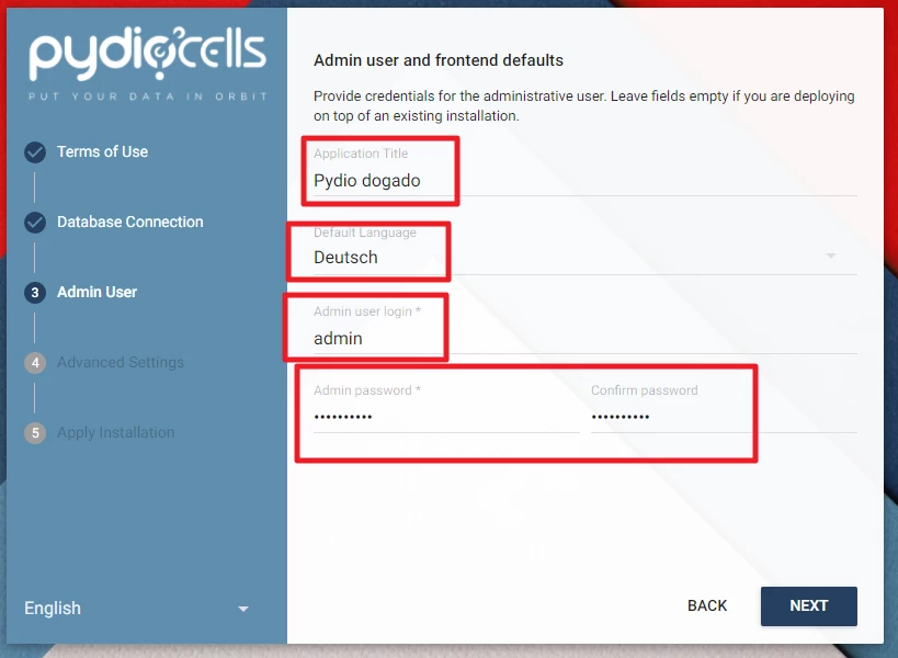 Anschließend könnt legt ihr noch einen Administrator Account an. Gebt hier einen Nutzernamen sowie Passwort an. Ebenfalls könnt ihr hier die Sprache sowie den Titel noch ändern.