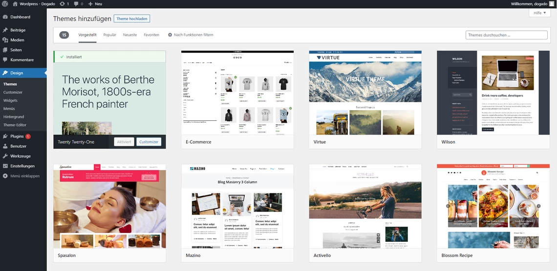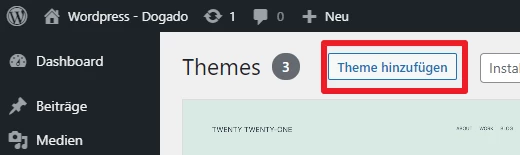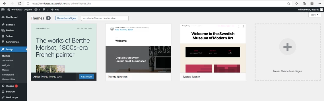 Hier wird uns nun angezeigt, dass 3 Designs installiert sind und aktuell das Design „Twenty Twenty One“ verwendet (aktiv) wird.