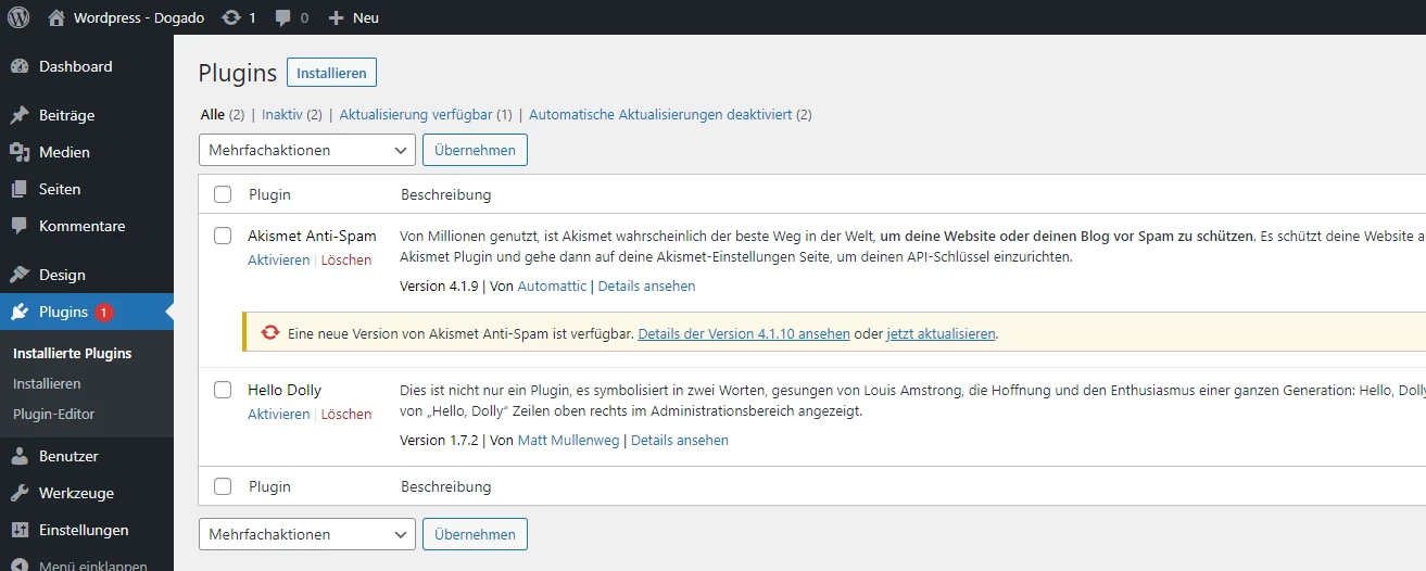 Hier seht ihr nun alle bereits installierten Plugins. In unserem Fall wäre sogar ein Update von „Akismet“ verfügbar, welches wir mit einem Klick auf „jetzt aktualisieren“ installieren können.