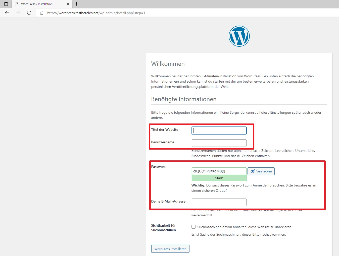 Hier gebt ihr nun den Titel eurer Webseite ein und legt einen Administrator und das Passwort fest. Aus Sicherheitsgründen solltet ihr diesen Account später nicht verwenden, um eure Artikel zu veröffentlichen. So weiß ein Angreifer nämlich, wie euer Account heißt und er muss dann nur noch euer Passwort „erraten“. Nun könnt ihr Wordpress mittels „WordPress installieren“ installieren.