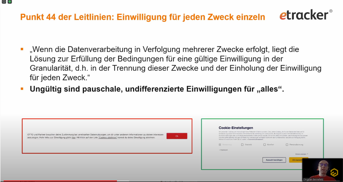 Der findet ihn aber in der ePrivacy-Verordnung. Das ist eine Verordnung, die sollte eigentlich parallel und zeitgleich mit der DSGVO in Kraft treten. Da steht im Detail drinnen, wie mit Cookies, Fingerprinting, Tracking und solchen Dingen umgegangen wird, aber sie ist immer noch nicht verabschiedet. Ob und wann sie tatsächlich in Kraft tritt weiß niemand. Also daran können wir uns auch nicht halten.