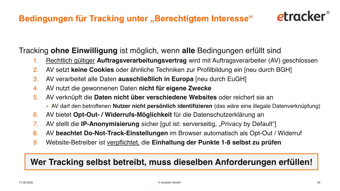 Der letzte Punkt, den ich noch nennen möchte, ist: Do not track. Das ist eine Einstellung, die die meisten Browser beherrschen, wo ich sagen kann, dass ich nicht getrackt werden möchte. Auch das gilt als Widerruf und muss tatsächlich auch beachtet werden vom Auftragsverarbeiter. Wichtig ist, wenn ihr so etwas einführt unter dem berechtigten Interesse, müsst ihr den Auftragsverarbeiter in den Punkten eins bis acht genau geprüft haben. Jeder Punkt muss einzeln geprüft werden, oder der Auftragsverarbeiter hat sich schon mal selbst prüfen lassen. Eine neutrale Zertifizierung ist hier möglich, sodass ihr euch darauf verlassen könnt. Jetzt sagt ihr vielleicht: "Das interessiert mich alles nicht. Wir verarbeiten die Daten selber, wir haben selber ein Analyticssystem installiert.". Das hilft nicht dem Datenschutzrecht zu entkommen. Man muss genau dieselben Anforderungen erfüllen, egal, ob ich einen Auftragsverarbeiter beauftrage, oder das Ganze im Haus betreibe.