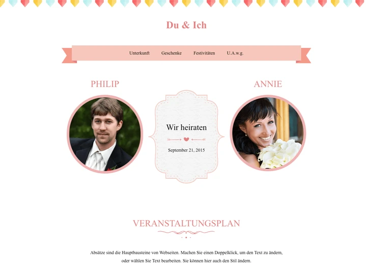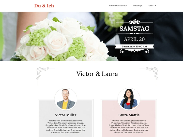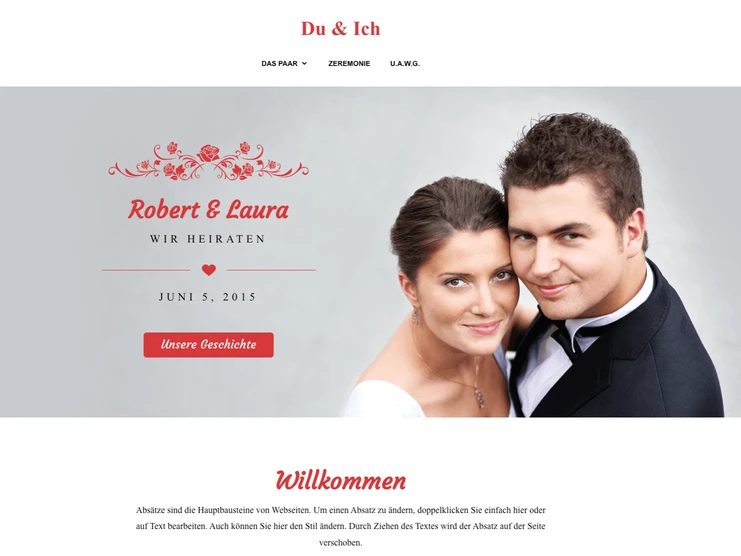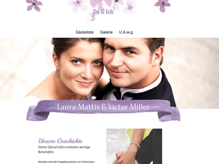 Das Erscheinungsbild eurer Website sollte zu euch als Paar passen. Wählt ein Design, das eure Persönlichkeit widerspiegelt, und setzt auf hochwertige Fotos sowie harmonische Farben – das macht einen professionellen Eindruck und stimmt eure Gäste auf die Feier ein.