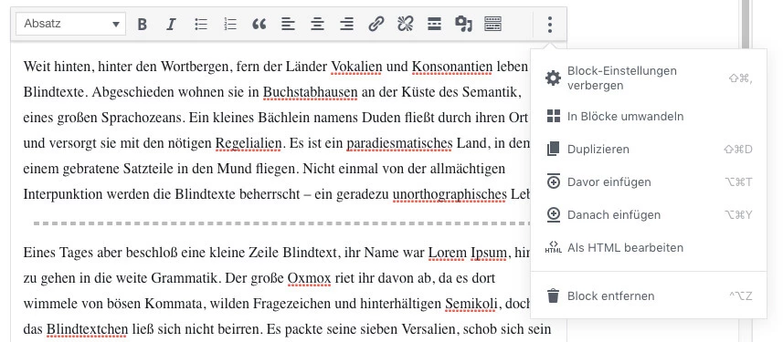 Anschließend werden die einzelnen Absätze, Überschriften und alle anderen Elemente in eigenen Blöcken dargestellt und können separat bearbeitet werden.