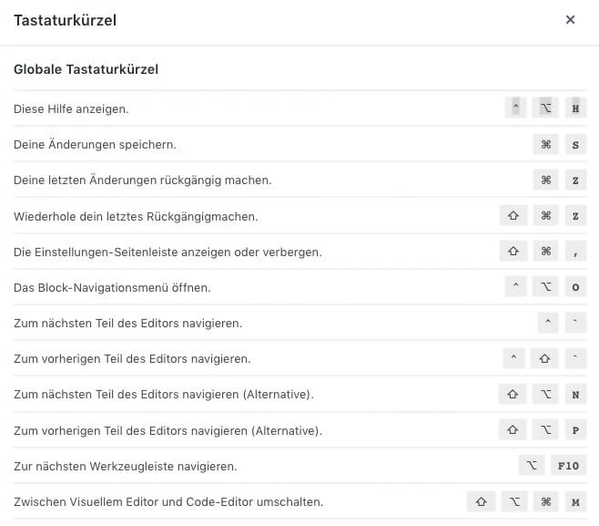 Der neue Editor bringt auch ein paar neue (und alte) Tastenkürzel mit. So ist es zum Beispiel möglich per Tastenkürzel Beiträge zu speichern, zwischen den Blöcken wechseln, zur nächsten Werkzeugleiste zu springen und vieles mehr. Diese Tastenkürzel können das Arbeiten mit dem Editor erheblich beschleunigen. Du findest alle Tastenkürzel im Block Menü an der rechten Seite oder über das Tastenkürzel "^⌥H".