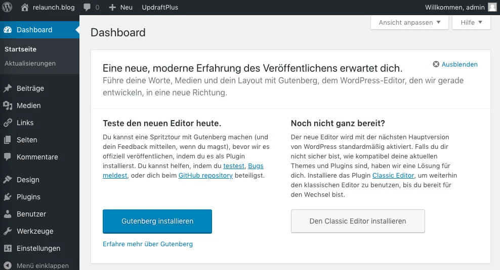 In der Version 4.9.8 wird dir die Installation des Gutenberg-Editors bereits auf dem Dashboard angeboten: