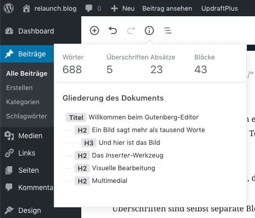 Du kennst es aus dem klassischen Editor: Die Anzahl der Wörter wird dort unter dem Textfeld angezeigt. Im Gutenberg Editor ist die Funktion nach oben gerutscht und zeigt zusätzlich noch weitere sinnvolle Informationen zu deinem Beitrag an: