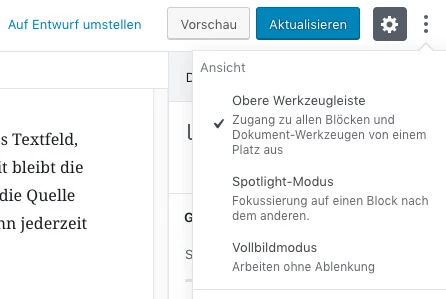 Wie schon in der klassischen Editor-Variante können auch in der Gutenberg-Version verschieden Ansichten zur Bearbeitung der Beiträge ausgewählt werden. Die Einstellungen erreichst du oben rechts, über die drei Punkte: