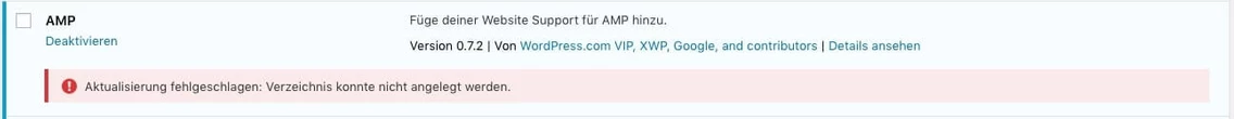 Sollte ein Update fehlschlagen, so bekommst du den Fehler direkt in deiner Plugin-Verwaltung angezeigt: