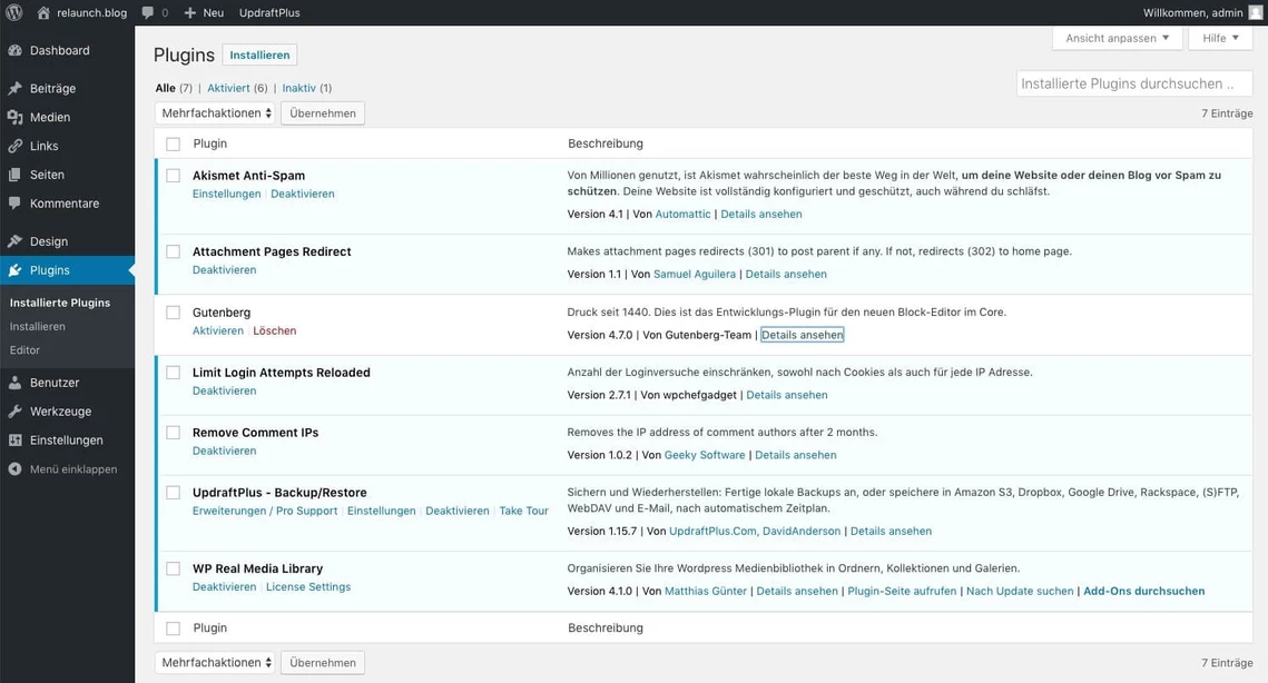 Alle Plugins werden zentral an einer Stelle im WordPress-Backend verwaltet. Klicke links in der Navigation auf "Plugins" und du erhältst eine Übersicht über die derzeit in deinem WordPress installierten Plugins: