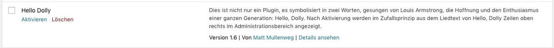 In einigen WordPress-Installationen taucht auch standardmäßig das Plugin "Hello Dolly" auf. Dieses Plugin wurde ursprünglich vom WordPress-Erfinder Matt Mullenweg programmiert, um die Leistungsfähigkeit von Plugins zu demonstrieren. Dieses Plugin kannst du löschen, da es dir in deinem Blog wahrscheinlich keinen Mehrwert bieten wird.