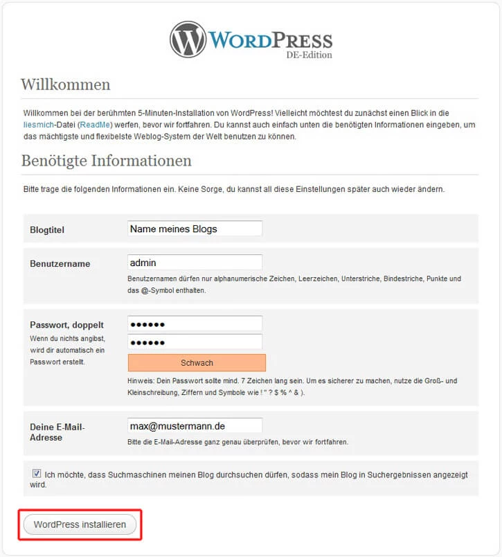Nun fehlt noch der Titel der Seite, eine funktionierende E-Mail-Adresse, ein Benutzername und das Passwort für den Administrationsbereich von WordPress. Das gibst du jetzt ein. Außerdem wählst du aus, ob dein neuer Blog auch in Suchmaschinen eingetragen werden soll. Anschließend klickst du auf "WordPress installieren", um die Installation abzuschließen.
