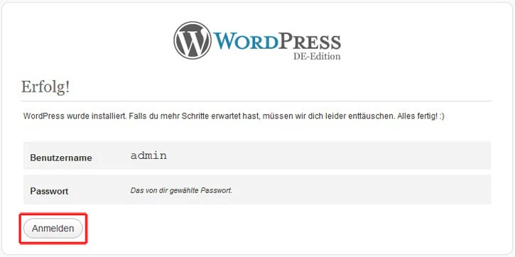 Damit du dich Administrations-Seite deines Blogs einloggen kannst, benötigst du noch den Login und ein spezifisches Passwort. Beides bekommst du nun angezeigt.