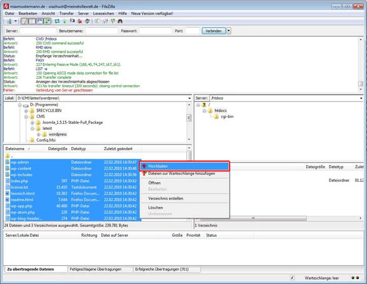 Nun öffnest du deinen FTP-Client (z.B. FileZilla). Nun verbindest du dich zu deinem Webhosting mit den FTP-Zugangsdaten und suchst anschließend den Ordner, den du entpackt haben möchtest. Jetzt wählst du die Ordner und Dateien von WordPress aus, die du im Verzeichnis /wordpress findest.