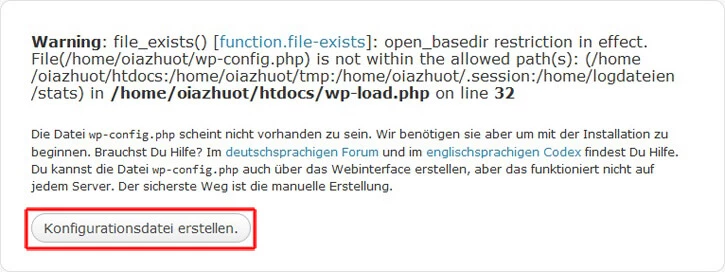 Nach dem Transfer öffnest du nun deinen Browser und gibst deinen Domainnamen ein. In der Hoffnung, dass alles korrekt gelaufen ist, findest du an dieser Stelle nun eine Seite, die wie die im unteren Bild aussieht. Jetzt klickst du auf "Konfigurationsdatei erstellen", damit die Installation starten kann.