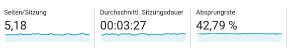 So viel Zeit verbringen die Nutzer durchschnittlich auf deiner Webseite. Gerade bei Blogs ist dieser Wert oft recht niedrig. Googles Definition dieser Kennzahl trägt hieran einen wesentlichen Anteil. Die Dauer einer Sitzung wird unterschiedlich berechnet, je nachdem ob auf der letzten besuchten Seite einer Sitzung eine Interaktion erzielt wurde - also mindestens ein Klick, reines Lesen zählt nicht dazu. Ruft ein Nutzer also einen Beitrag auf, braucht dieser etwa fünf Minuten um den Beitrag zu lesen und verlässt danach deinen Blog, werden diese fünf Minuten nicht in der Sitzungsdauer erfasst - denn eine Interaktion erfolgte nach Google nicht.